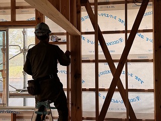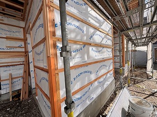 外部はサッシも取り付けられ、外壁下地の胴縁も施工されています。