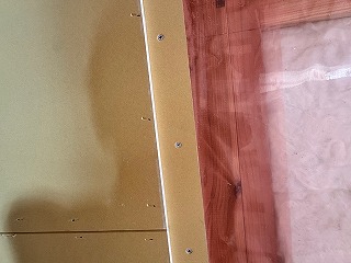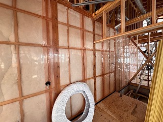 界壁の反対の部分ですが、界壁の中は断熱材が施工されており、防湿ビニルシートを貼っています。