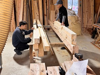 今日は土台の墨付けのようです。差し金、墨つぼをまだうまく扱えていませんが、真剣に取り組んでいる姿は新入社員と言えどもカッコよく見えます。