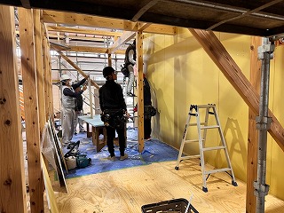 その後3班に分かれて界壁の施工です。まず断熱材を入れていきますが、筋交いの入ってる部分は隙間なく入れなければいけません。大工さんの中では正しい入れ方を知らない人もいました。その後石こうボード2重貼りを両面で行います。一枚目の石こうボードと二枚目の石こうボードの継ぎ目はずらさなければいけません。こういった知識も再確認ですね。