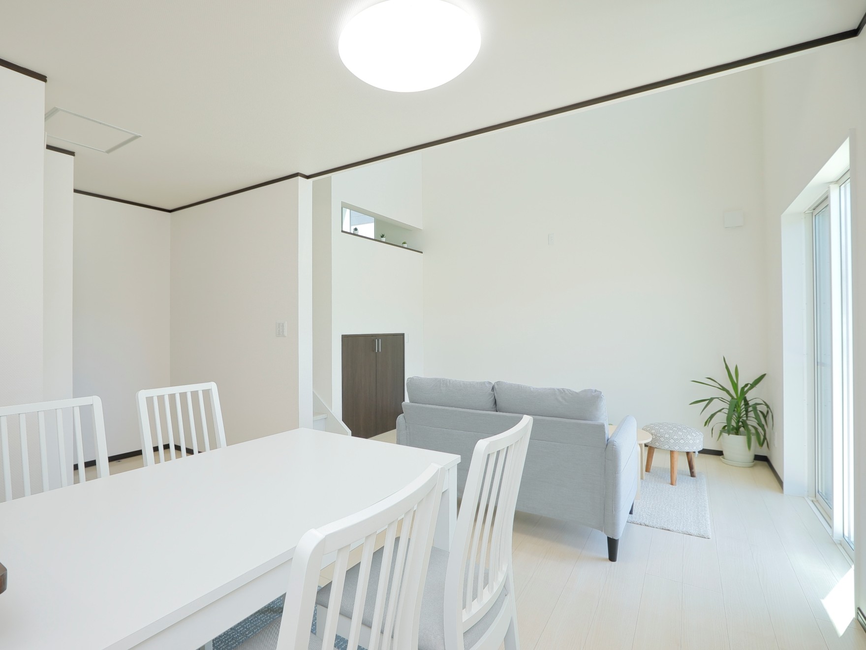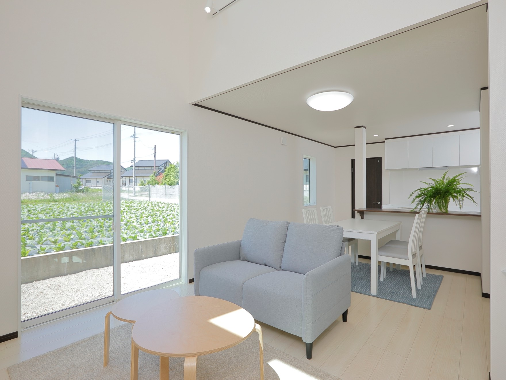 窓から見える畑の景色、吹き抜けリビングに差し込むやさしい光。自然の中で、家族の会話がふえる毎日を。動線にもこだわり、ナチュラルな素材感とシンプルなデザインが心地よい、賃貸戸建て住宅です。
