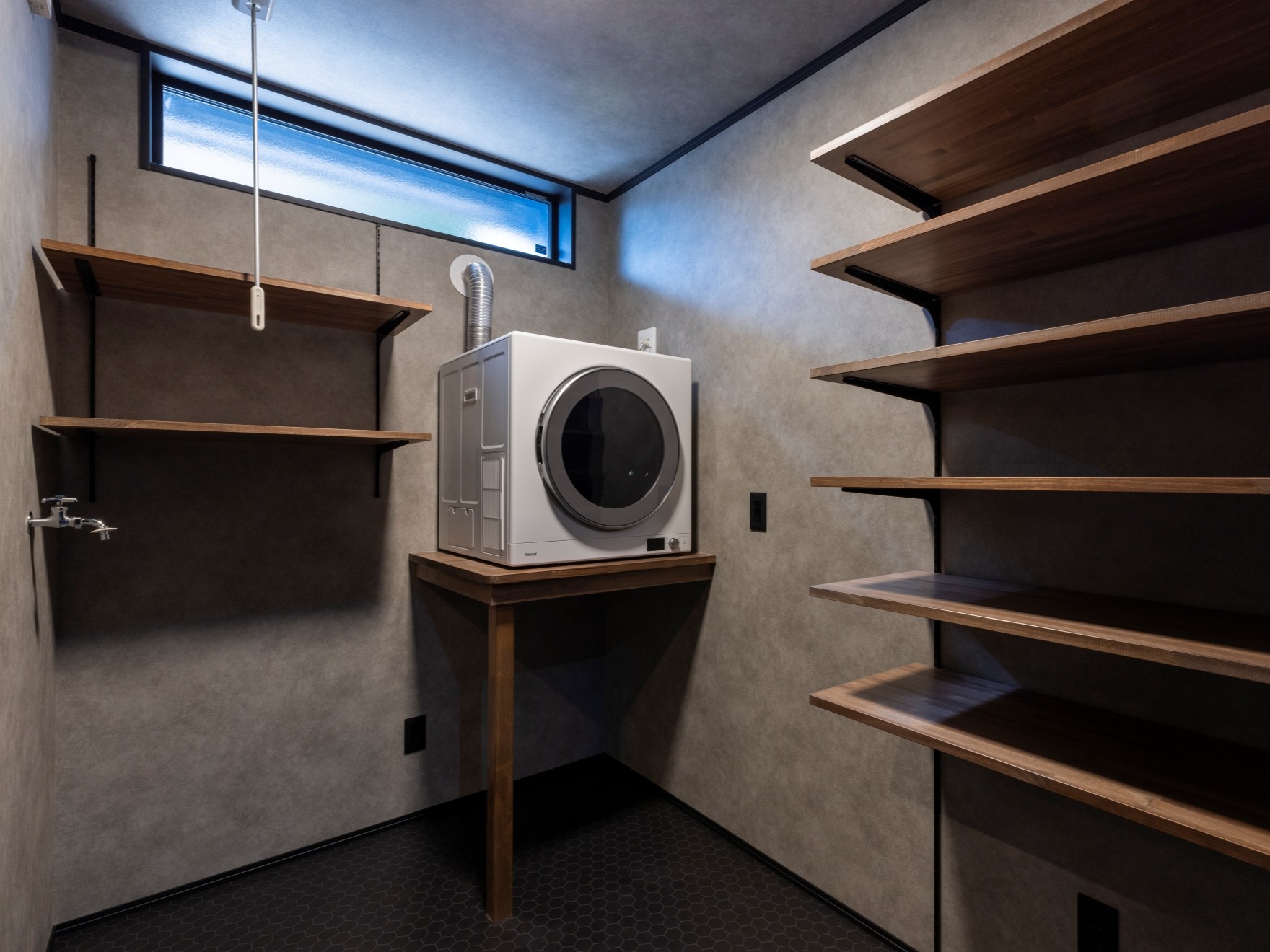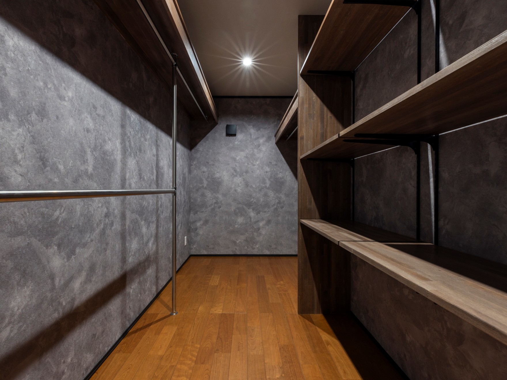 クローゼットは落ち着いたカラーで仕上がってます。棚は大工さんが造ったものです。