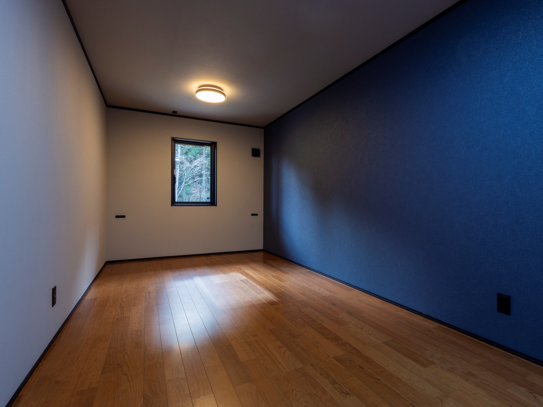 子供部屋はアクセントのある壁、そして辷出しの窓からは向かいの山が見えておりまるで額縁に入ってる絵のようです。