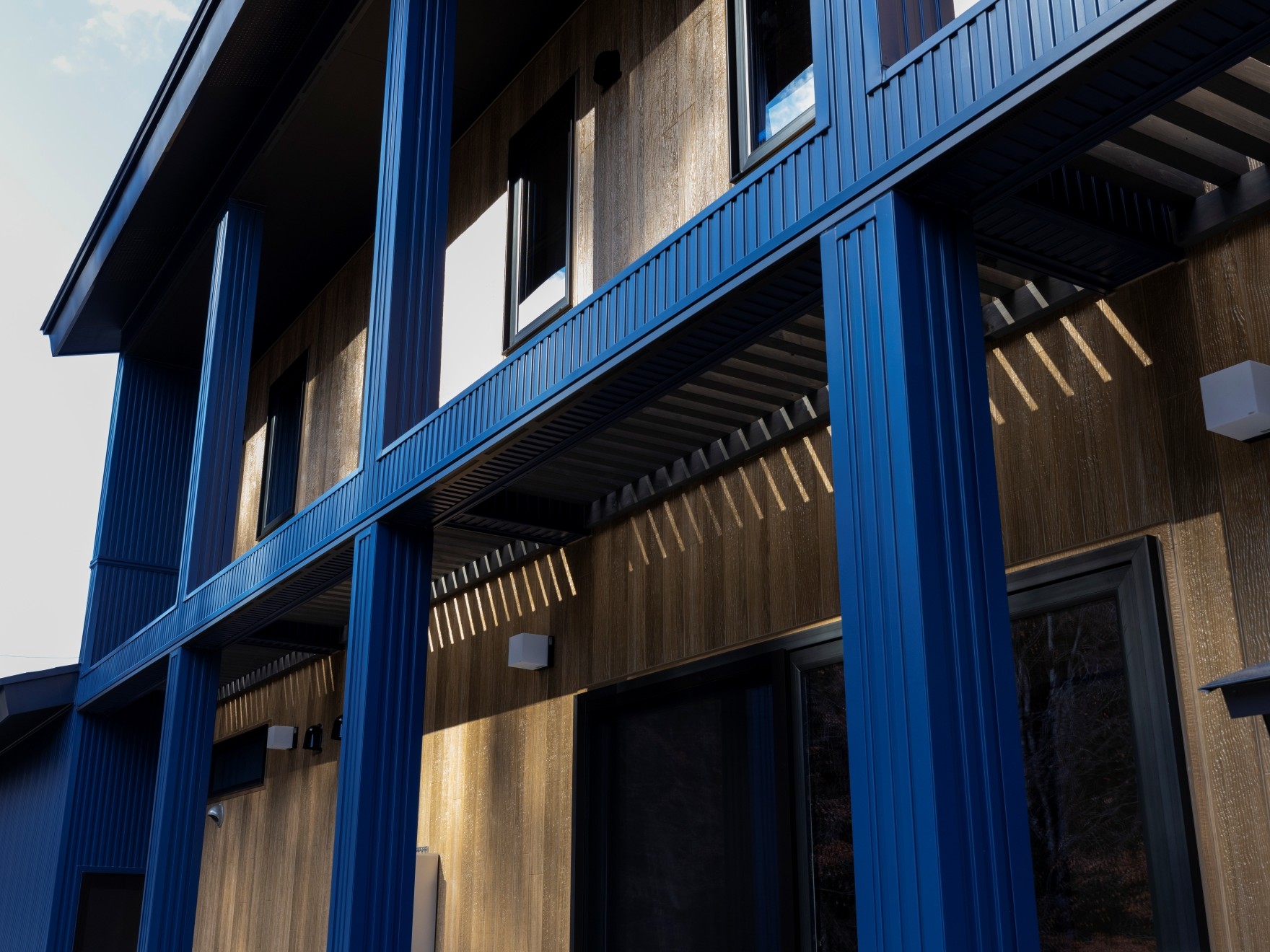山側の外観は木目調の外壁をアクセントとし自然に調和しています。注文住宅ならではのファサードです。