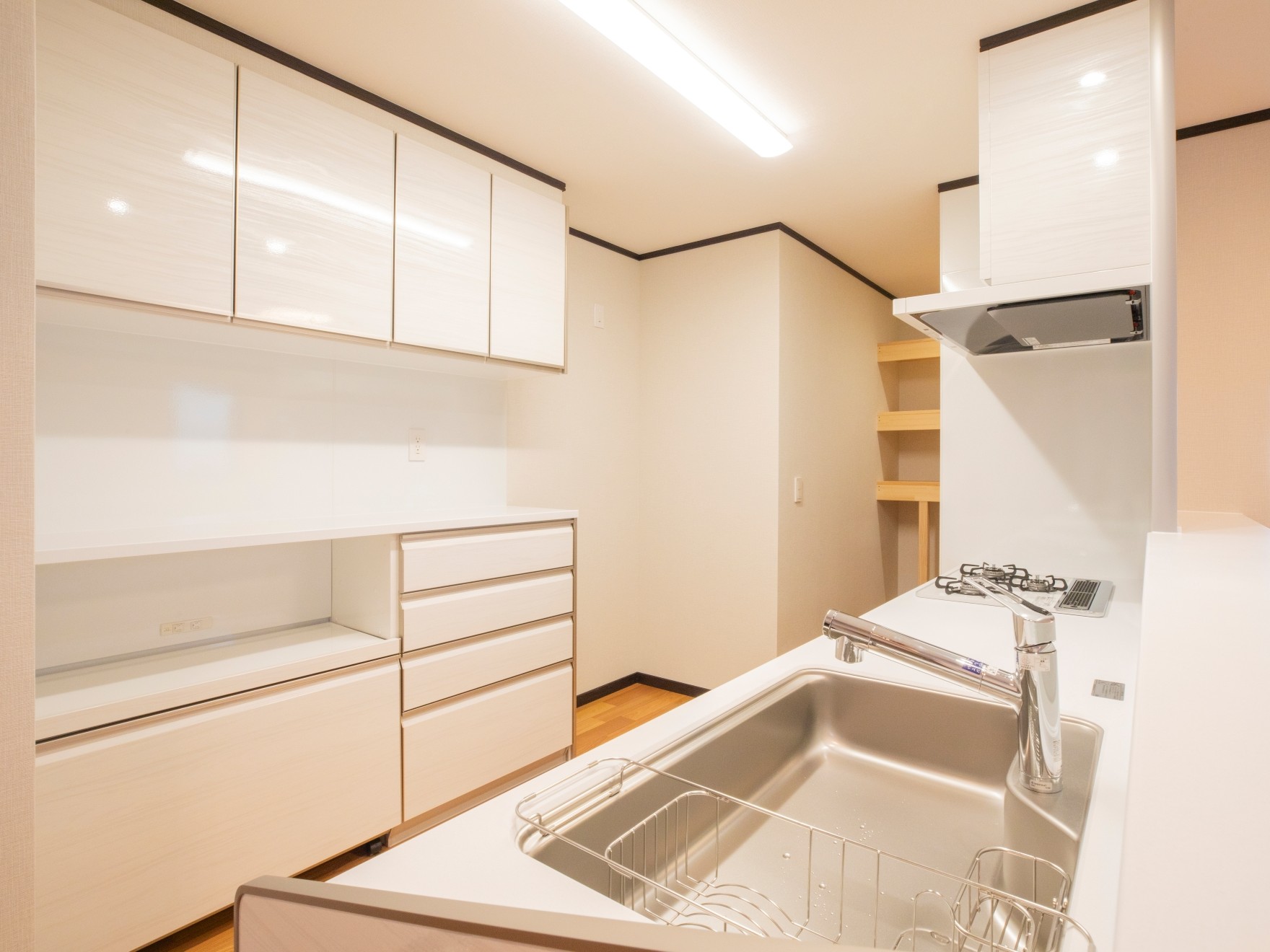 キッチンは白で統一されてます。奥の食品庫には大工さんが造った棚も見えています。