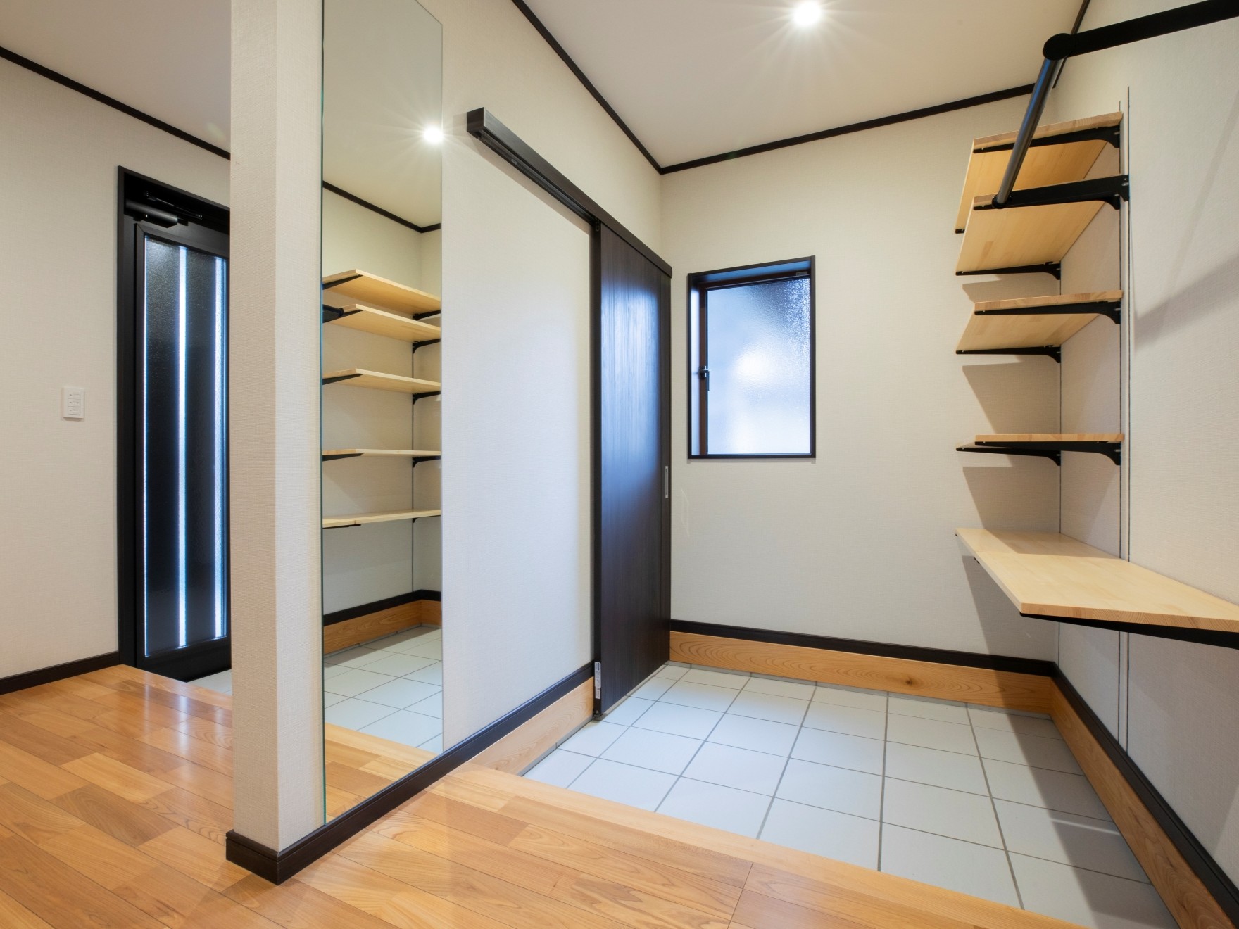 左側に玄関ドアがあり、手前の棚のある空間は靴置き場を兼ねた住人用の入口です。