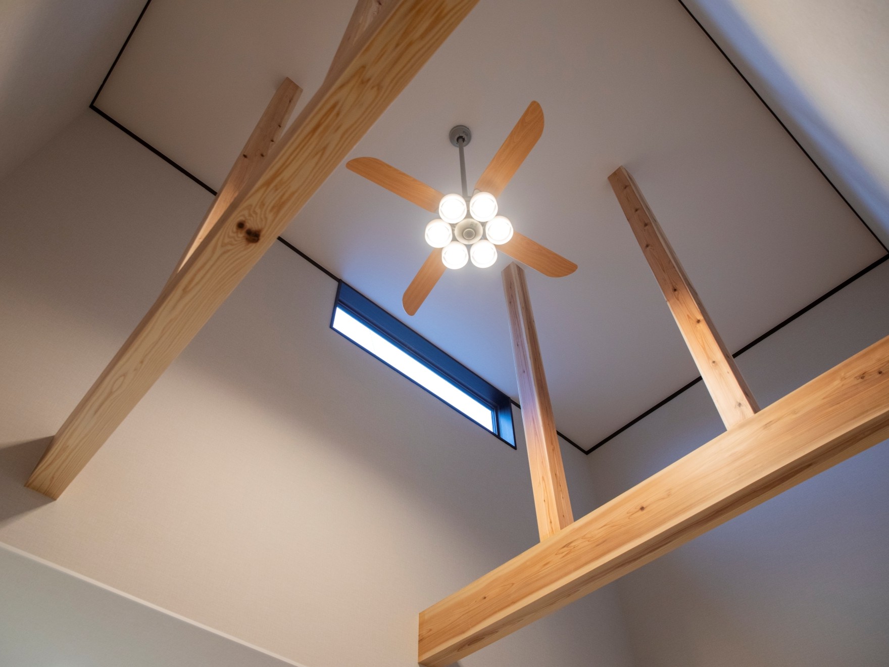 在来工法で造られた注文住宅。リビングには大きな桁材が見えています。