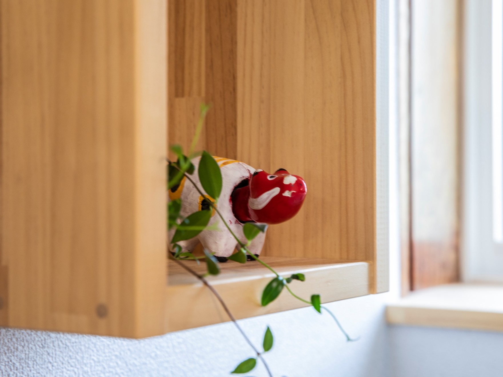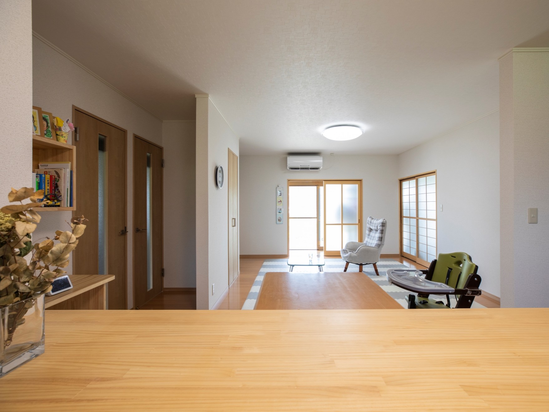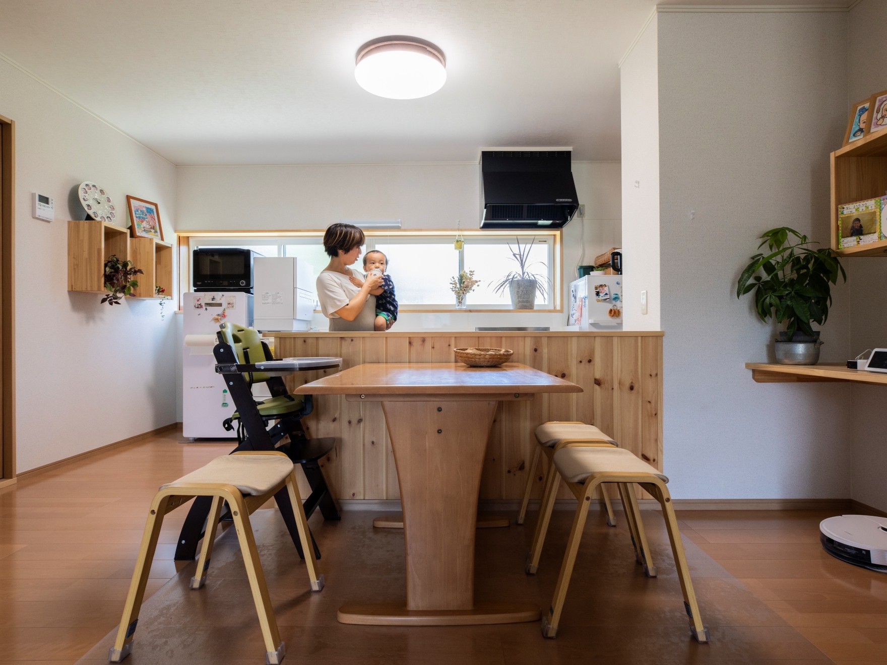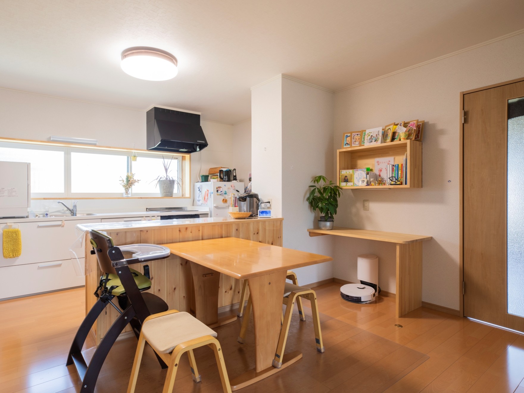 リフォーム前は、畳の部屋が多い純和風の家。施主であるHさんの「無垢材をできるだけ多く使用したい」というご要望に応じ、腰壁やフローリングを無垢材で仕上げました。アクセントとなる小さな棚もHさんのお気に入りです。 リフォームによりモダン和風な佇まいとなり、断熱性能・耐震性能もアップ。これからも子どもたちと安心して住まえる家に生まれ変わりました。