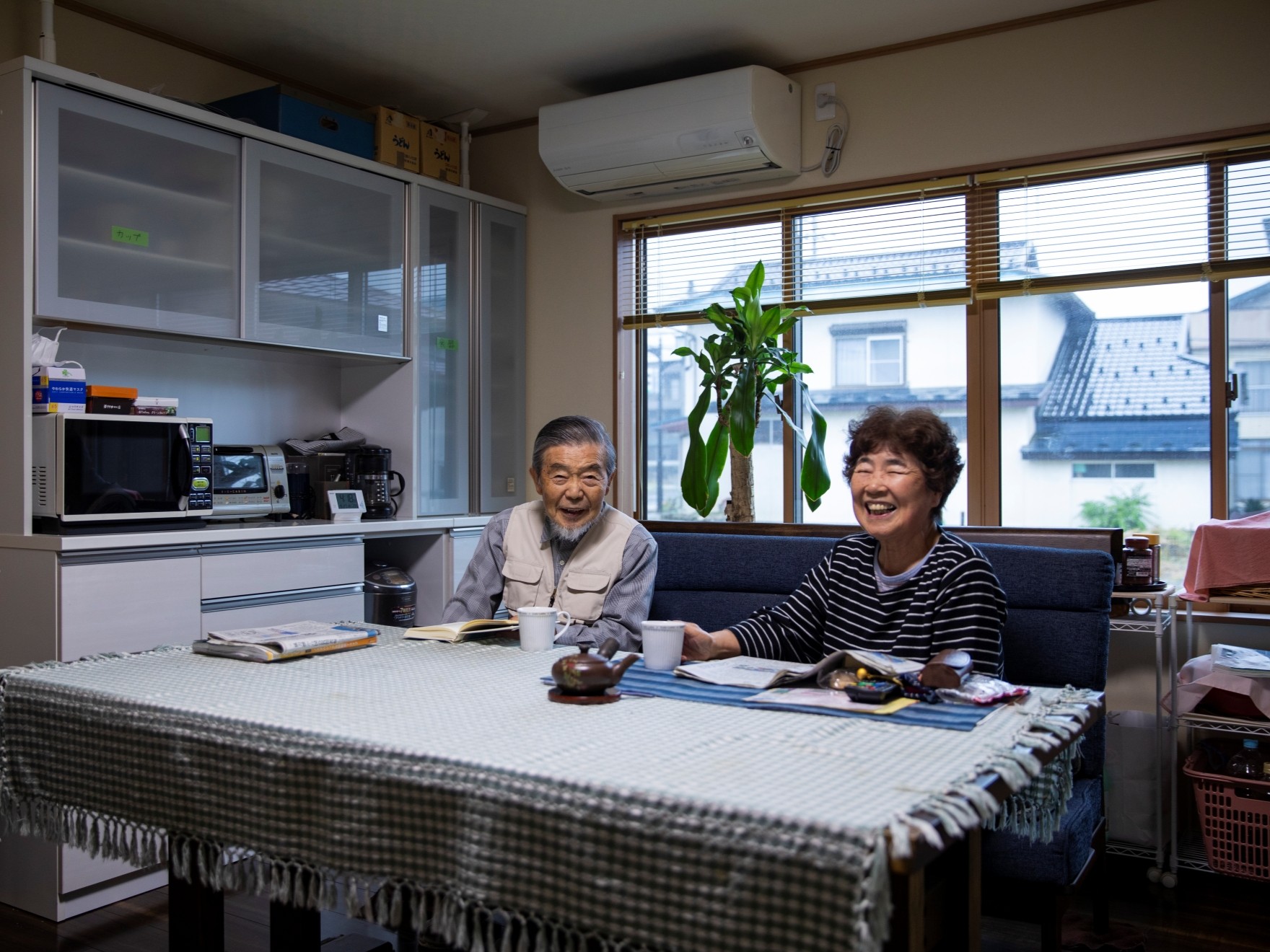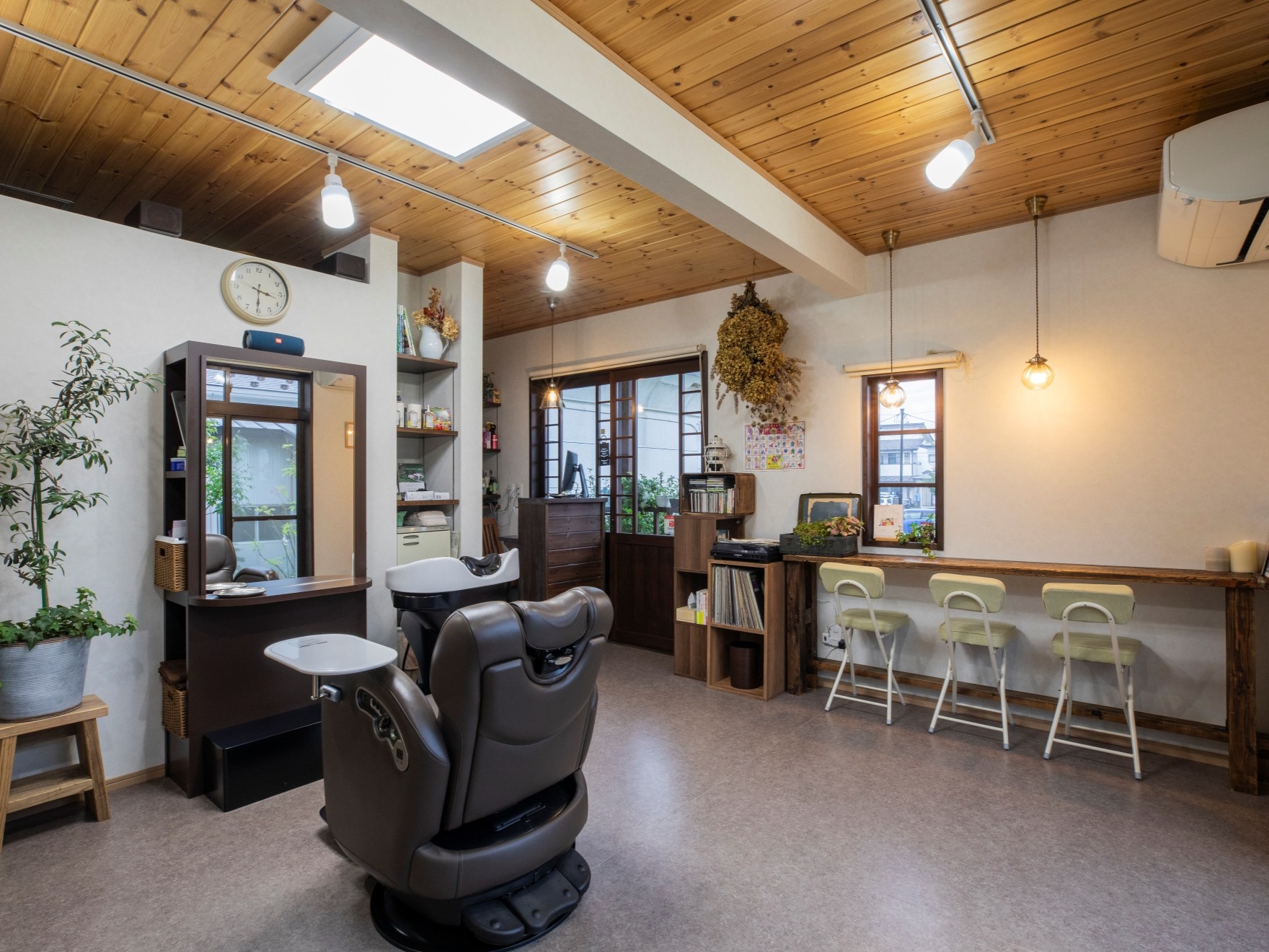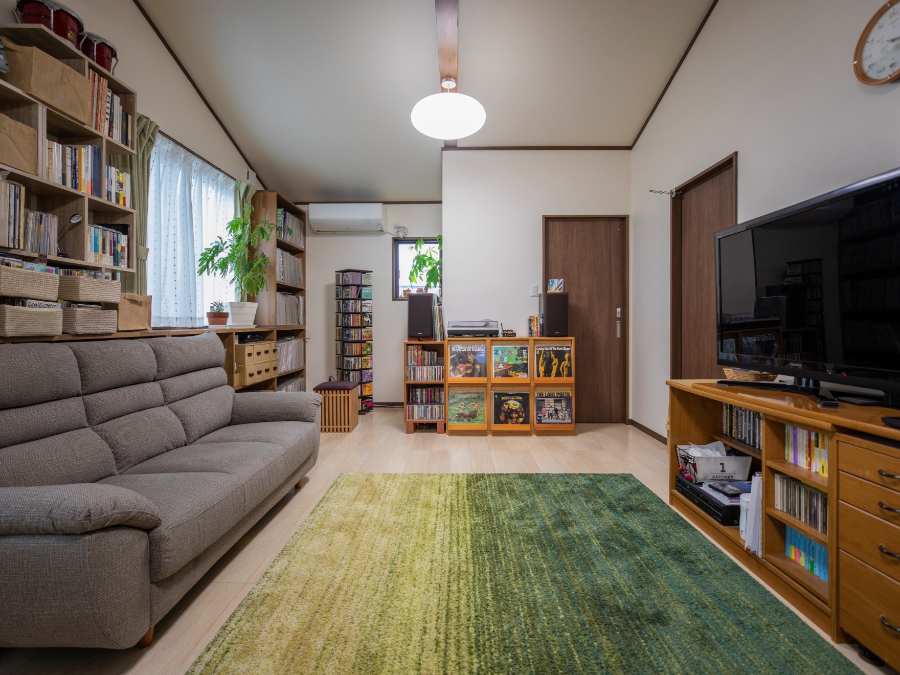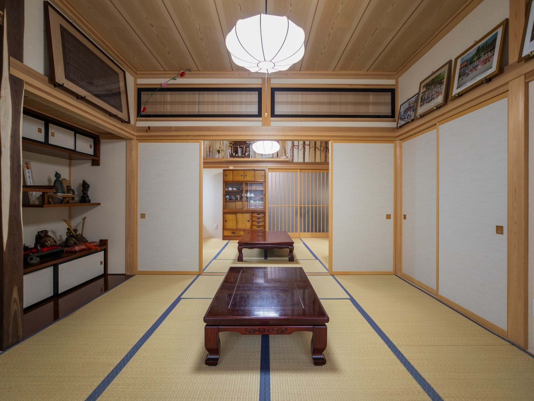 会津田島には、祇園祭の担当年に一年神主として催事を行う「お党屋(おとうや)」と呼ばれる家があります。この家は、この家はお党屋で、会津田島祇園祭では多くの来客があることから、伝統的な和の要素を取り入れた設計としました。また、奥様が美容師ということもあり、1階に美容室を併設しています。2階は、トラディショナルな1階とは一線を画し、あえて無垢材の梁を見せた和風モダンの空間に。音楽を愛する施主さんのために、大工がたくさんのレコードやCDを収納できる棚を手造りしました。