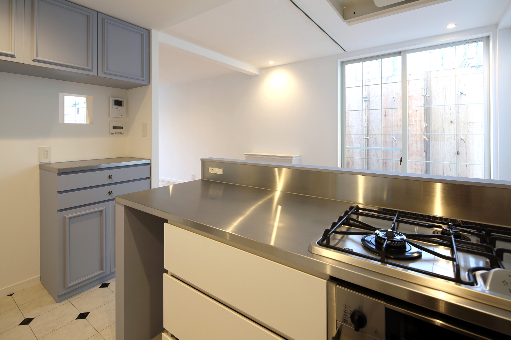 キッチンには、清潔感のあるステンレスの天板と収納力のあるキャビネットを採用。