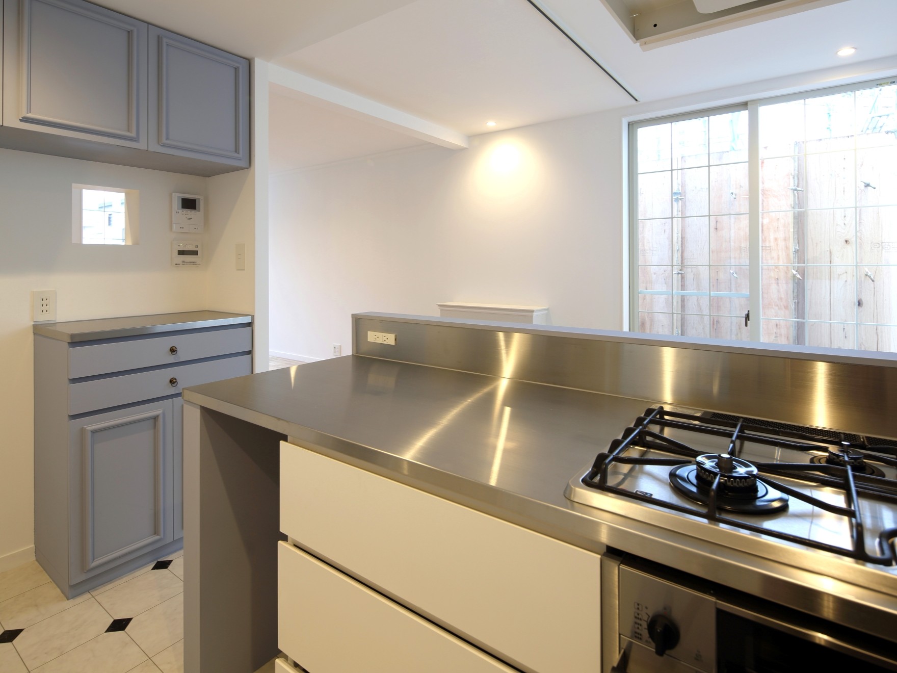 キッチンには、清潔感のあるステンレスの天板と収納力のあるキャビネットを採用。
