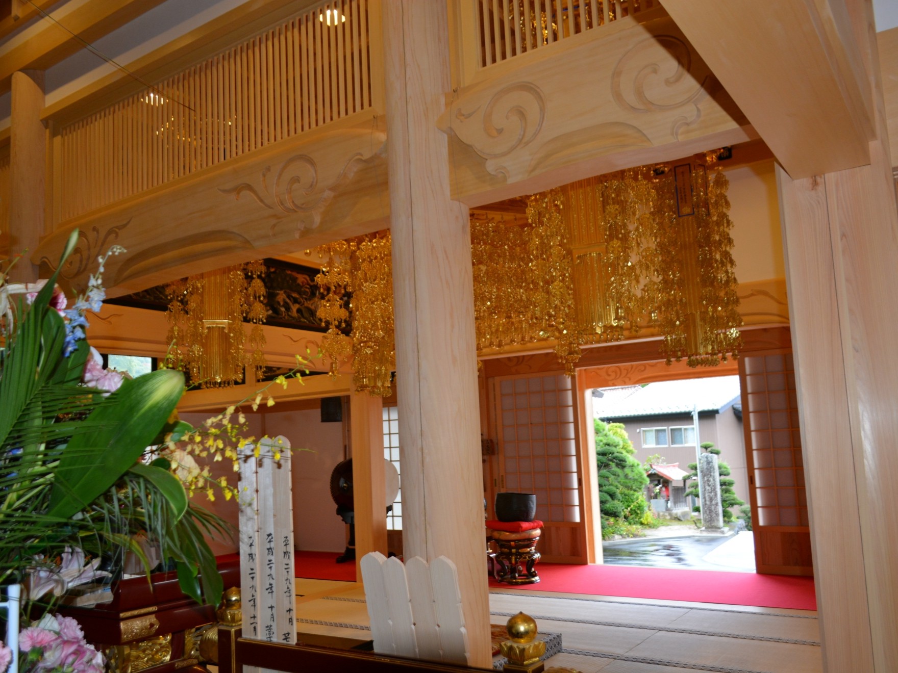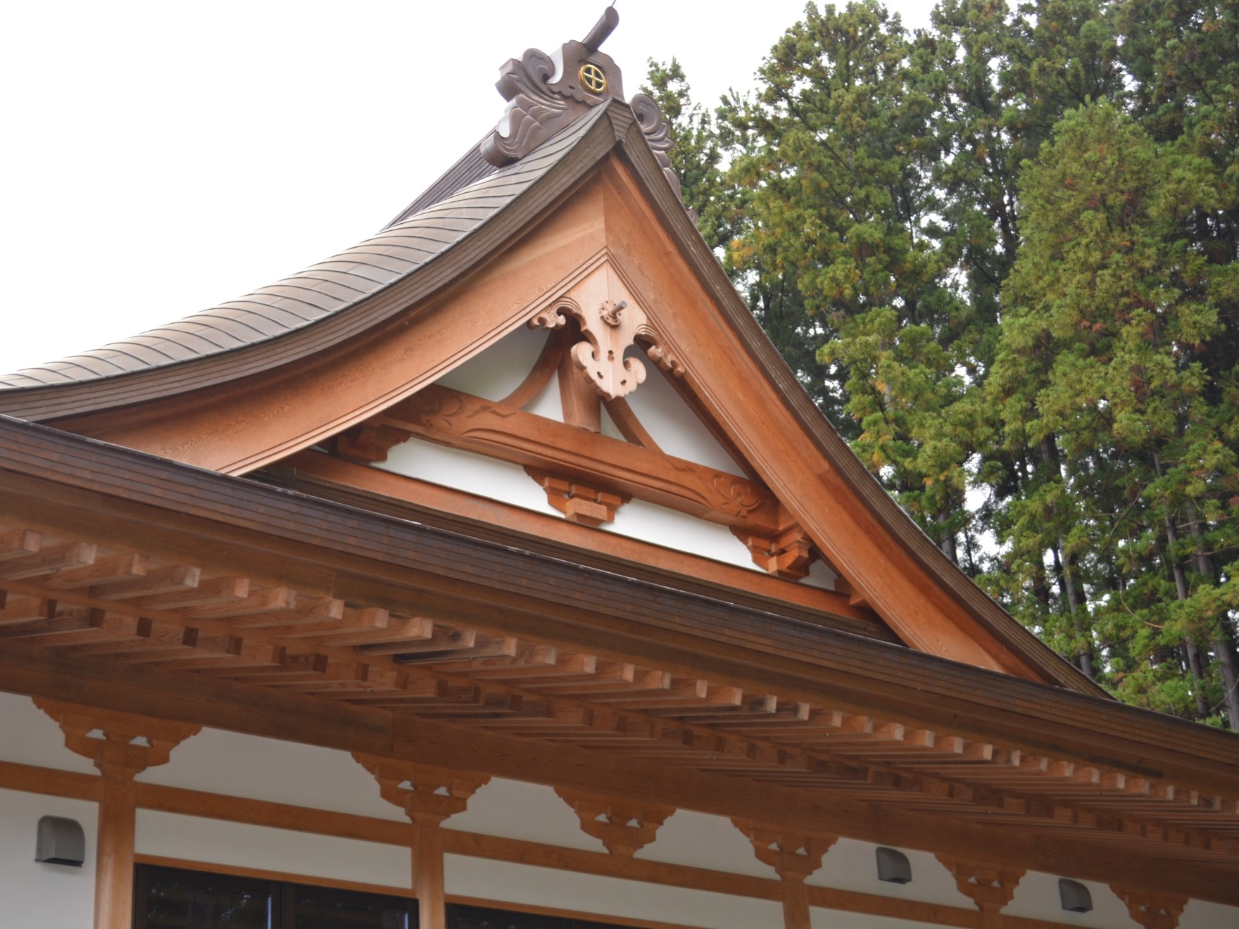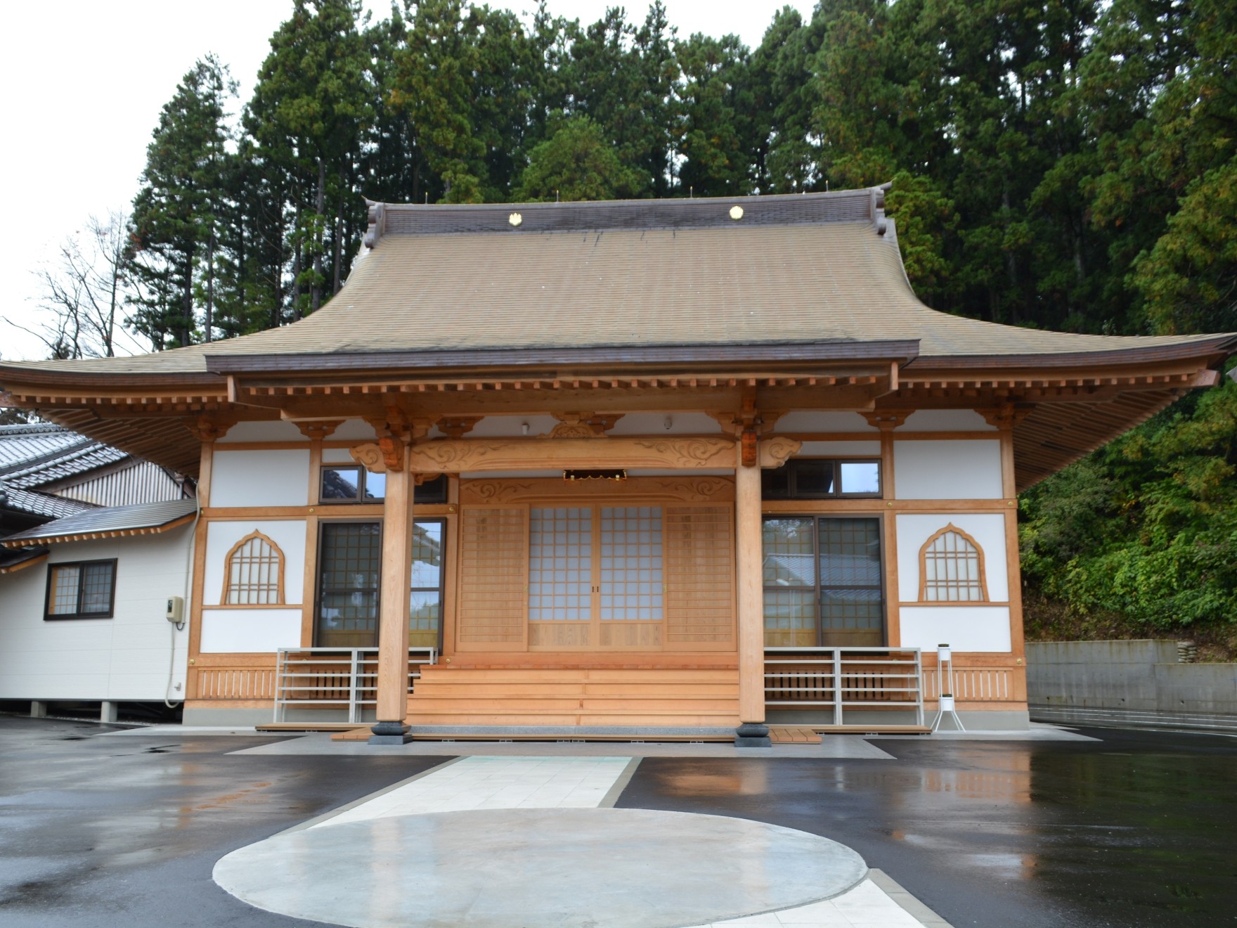 お寺の新築です。彫刻など当社の宮大工の技術があちこちに見られます。