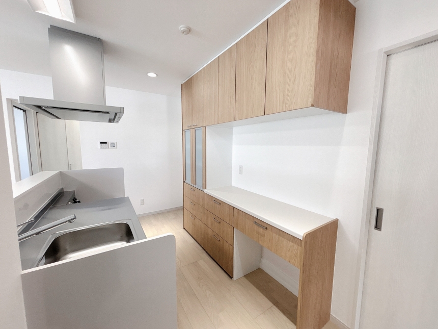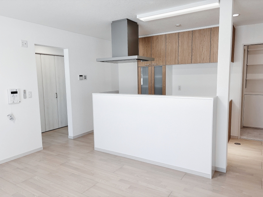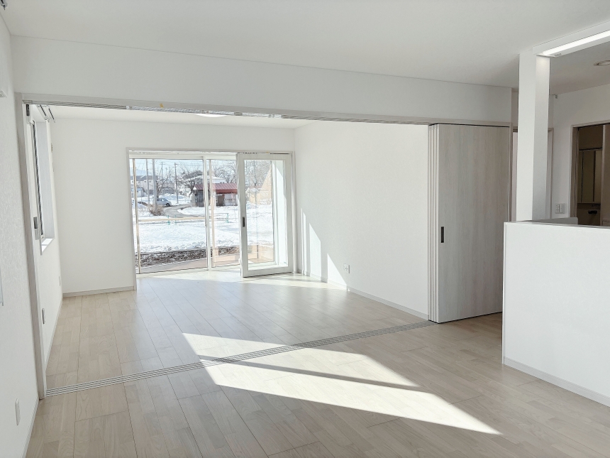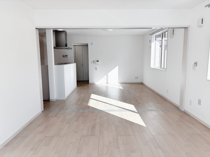 対面式キッチンを中心とした明るいLDK。写真奥は引き戸で仕切られたリビングとなっており、必要に応じて空間をゆるやかに分けることができます。さらにリビングの南側にはサンルームを設け、奥行きのある開放的な間取りとなっています。