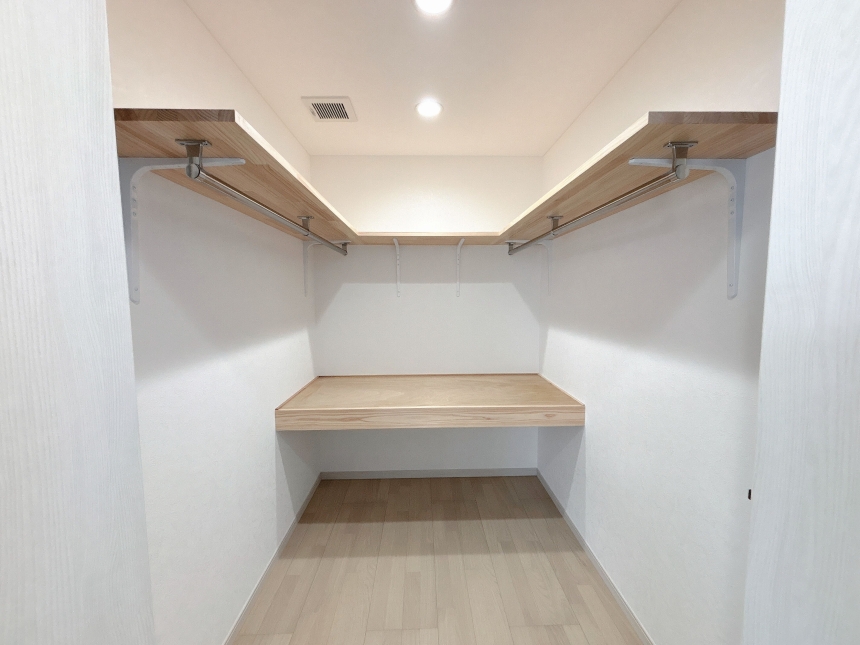 洗面スペースの横には、可動棚を備えた収納を設けています。収納する物に合わせて棚の高さを自由に調整できるため、タオルや日用品、ストック品まで無駄なく整理できます。