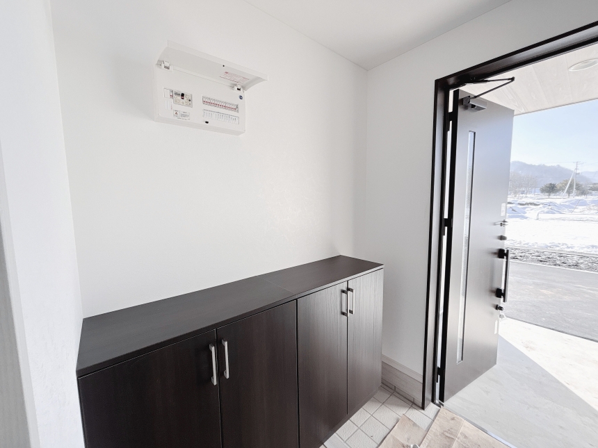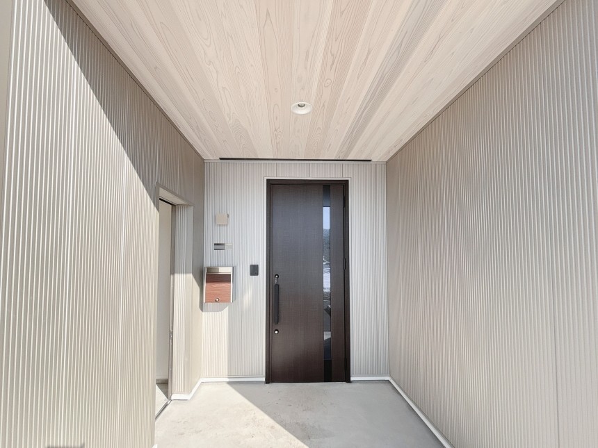 玄関ポーチのすぐ横には物置を設け、外回りの道具や季節用品をすっきり収納できます。