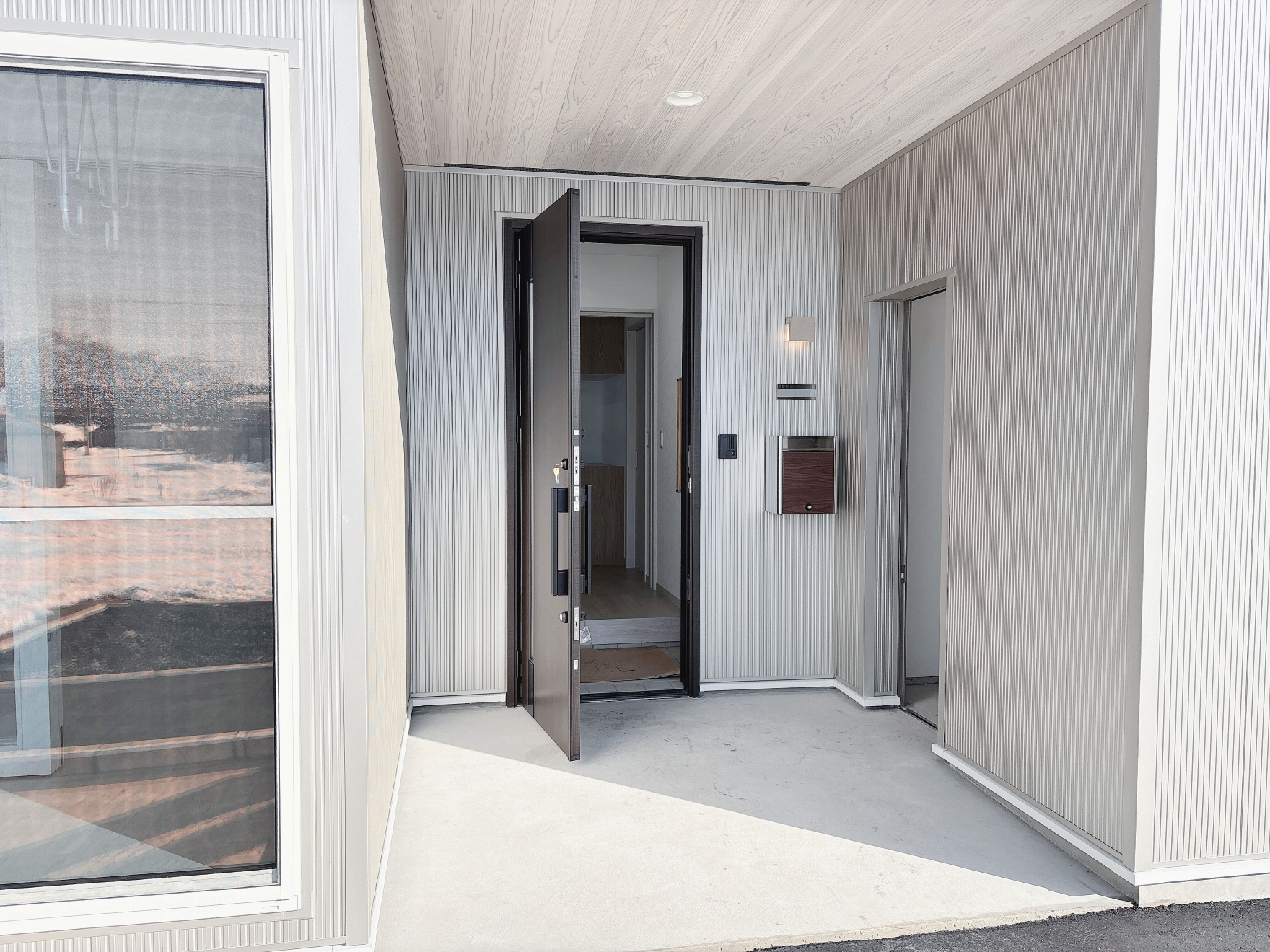 玄関ポーチのすぐ横には物置を設け、外回りの道具や季節用品をすっきり収納できます。