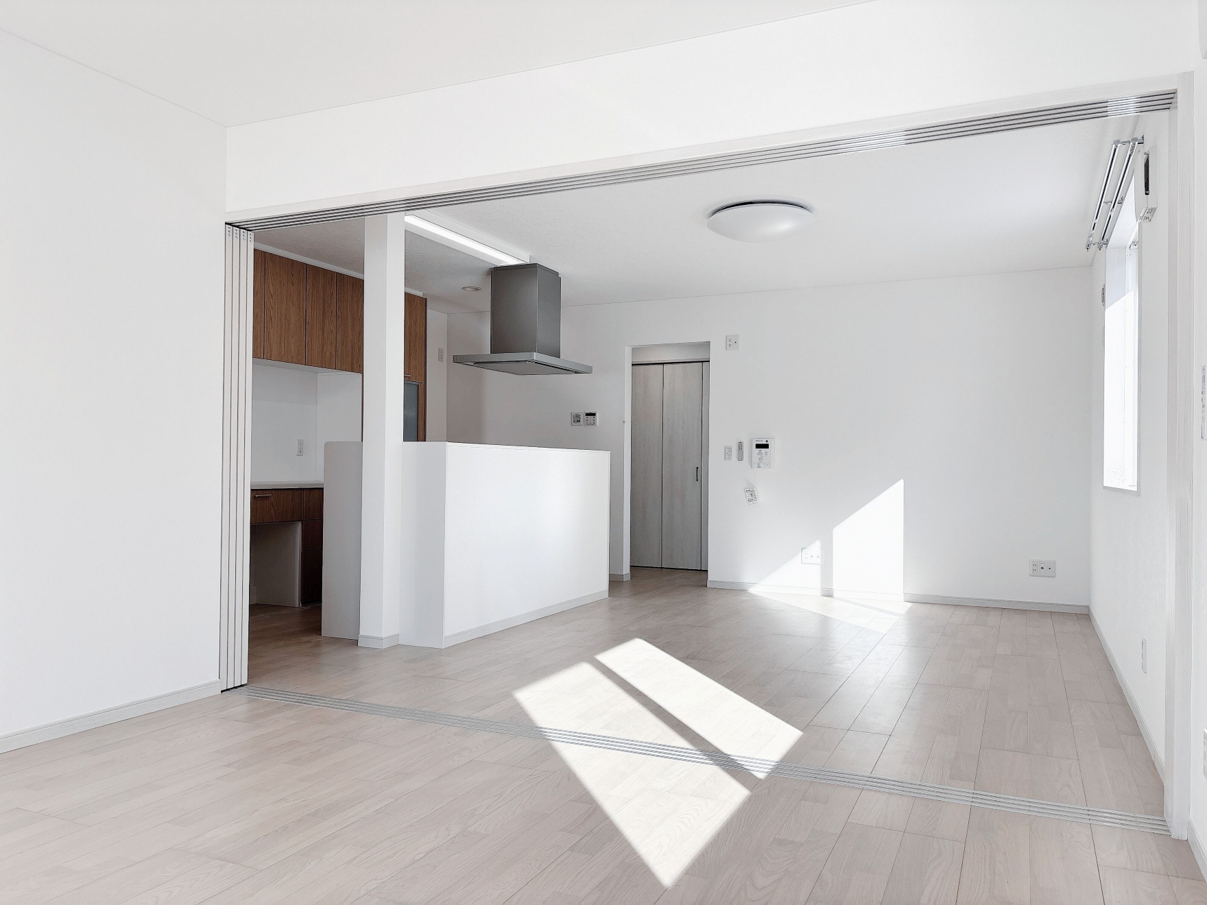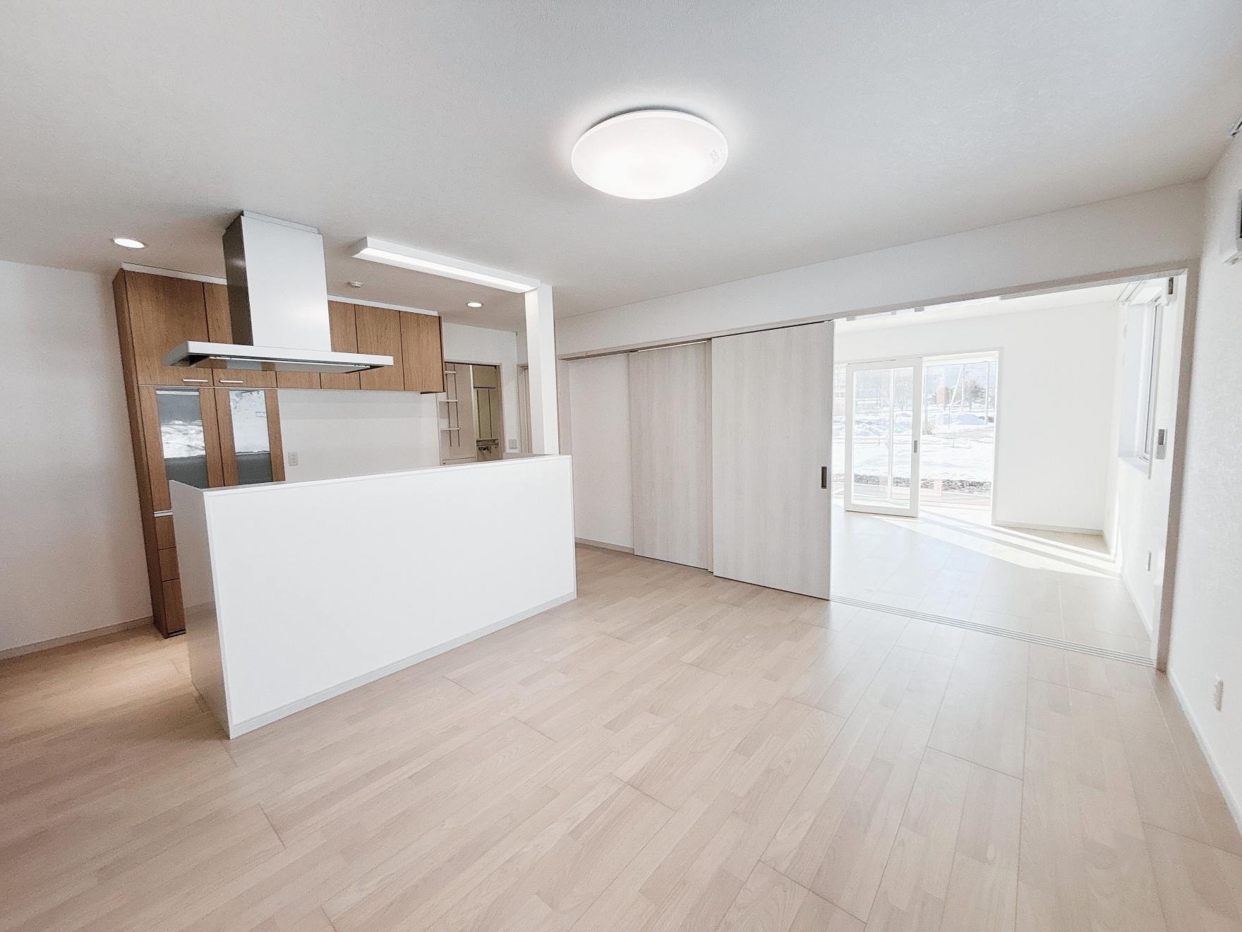 対面式キッチンを中心とした明るいLDK。写真奥は引き戸で仕切られたリビングとなっており、必要に応じて空間をゆるやかに分けることができます。さらにリビングの南側にはサンルームを設け、奥行きのある開放的な間取りとなっています。