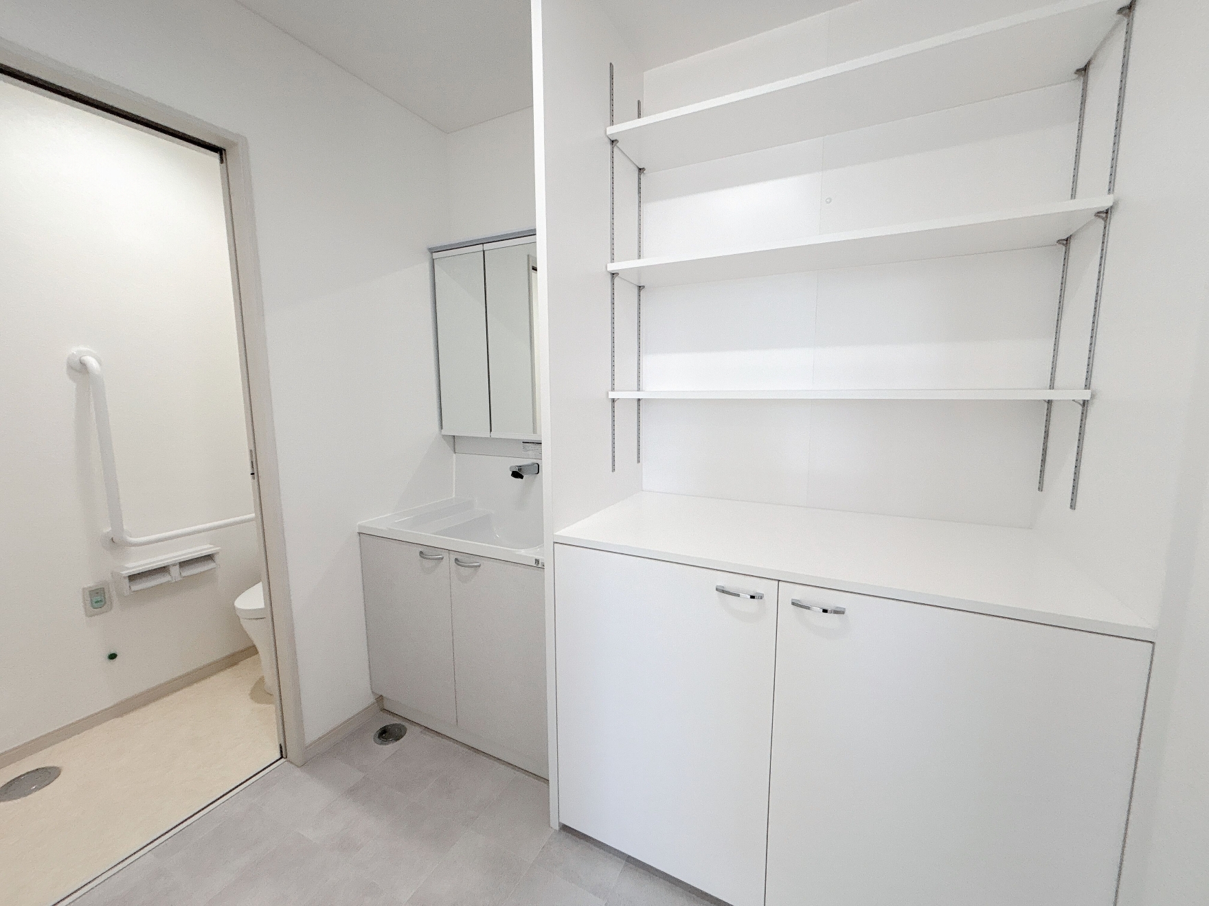 洗面スペースの横には、可動棚を備えた収納を設けています。収納する物に合わせて棚の高さを自由に調整できるため、タオルや日用品、ストック品まで無駄なく整理できます。