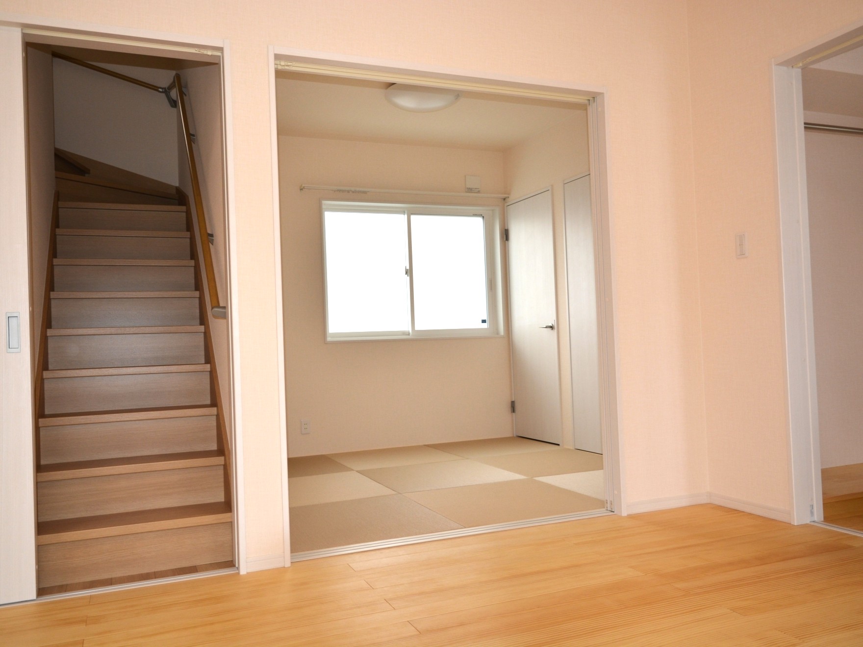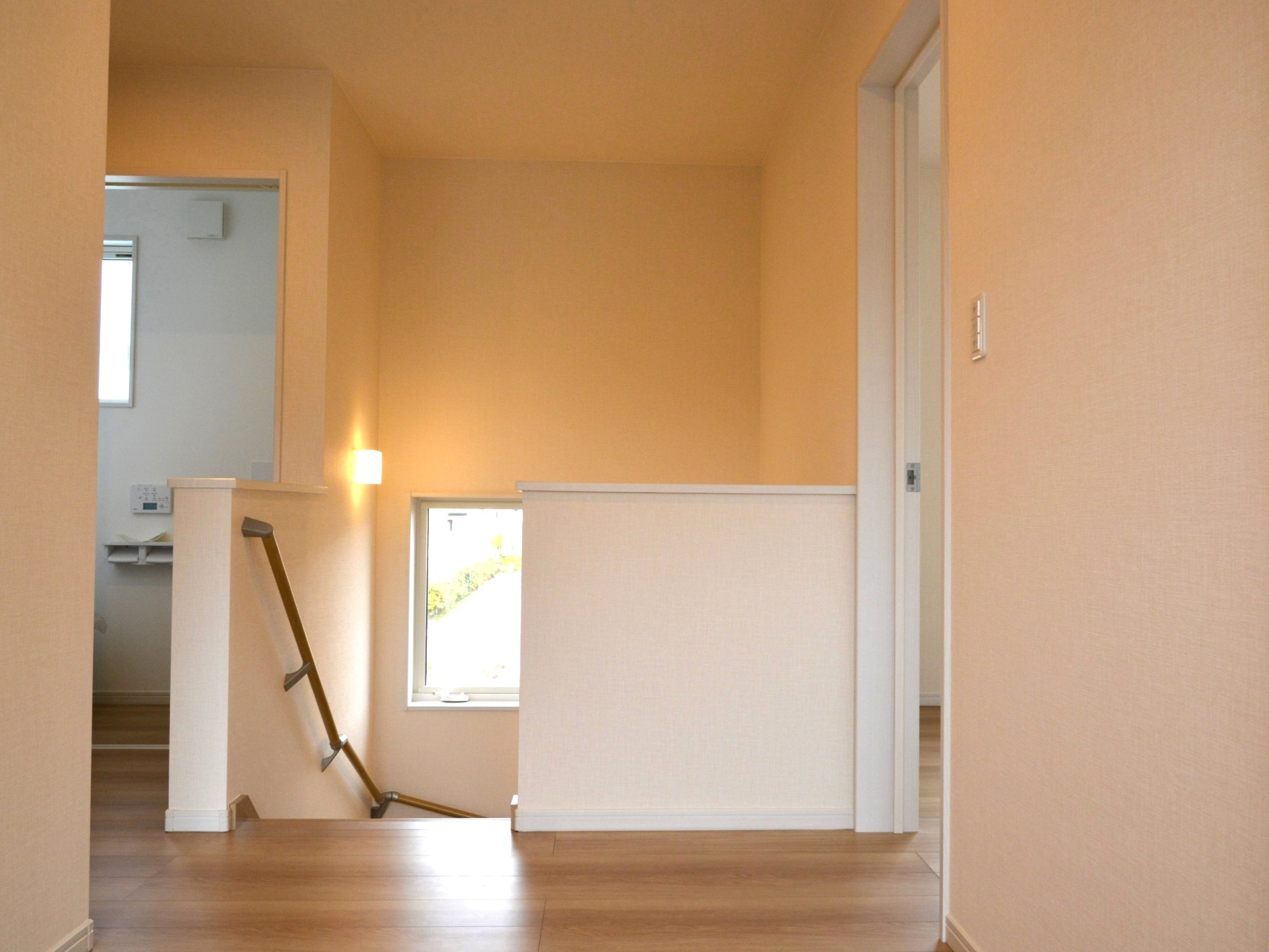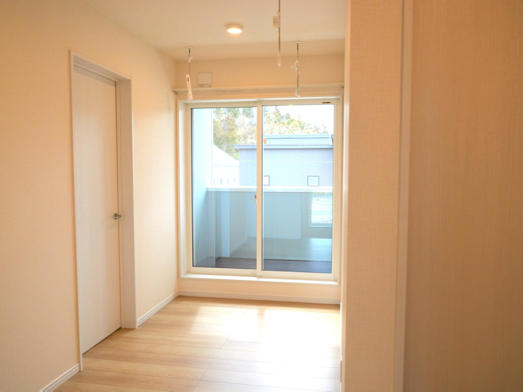 階段を上がって2階にはベランダがあり、出入口前には物干しも取り付けています。